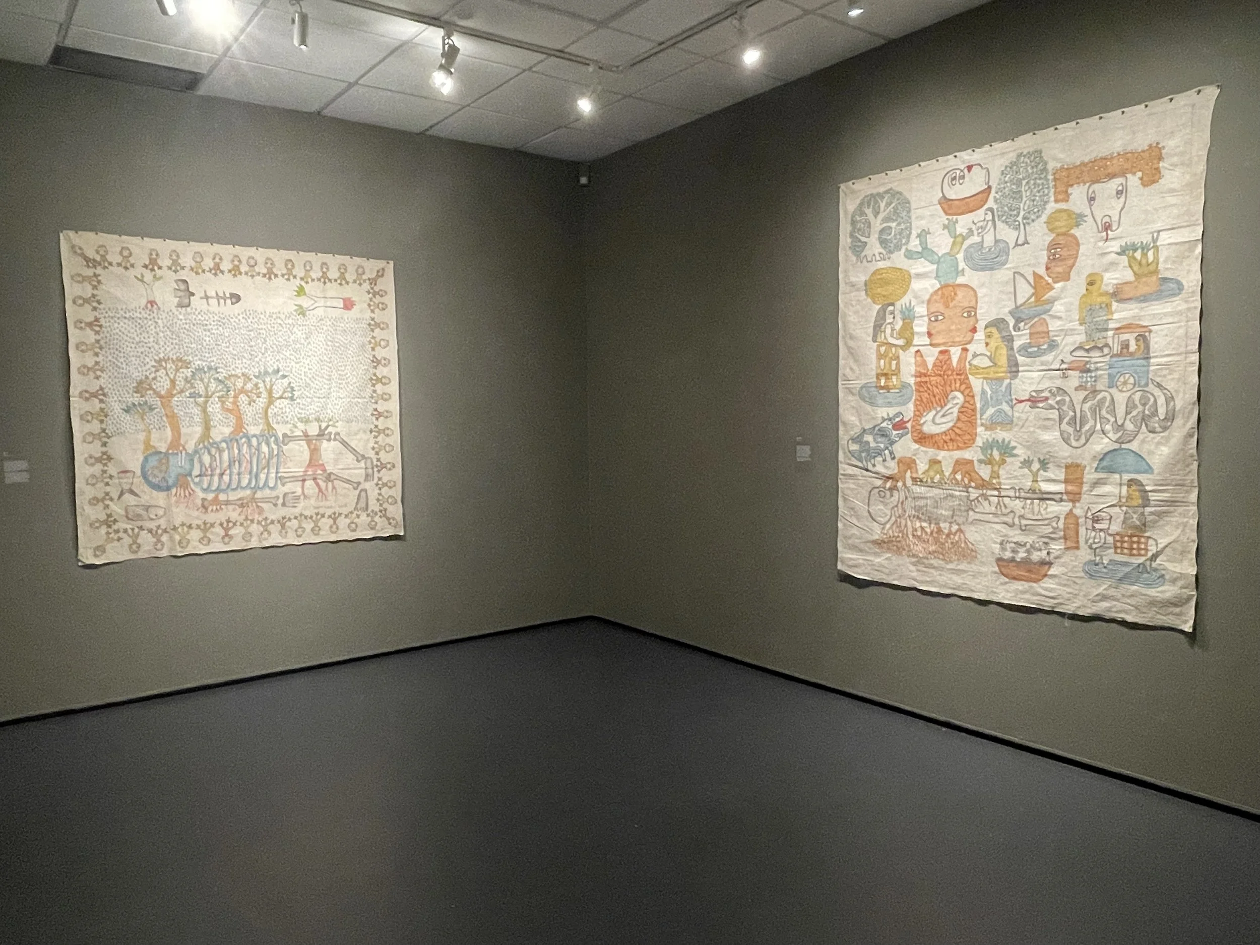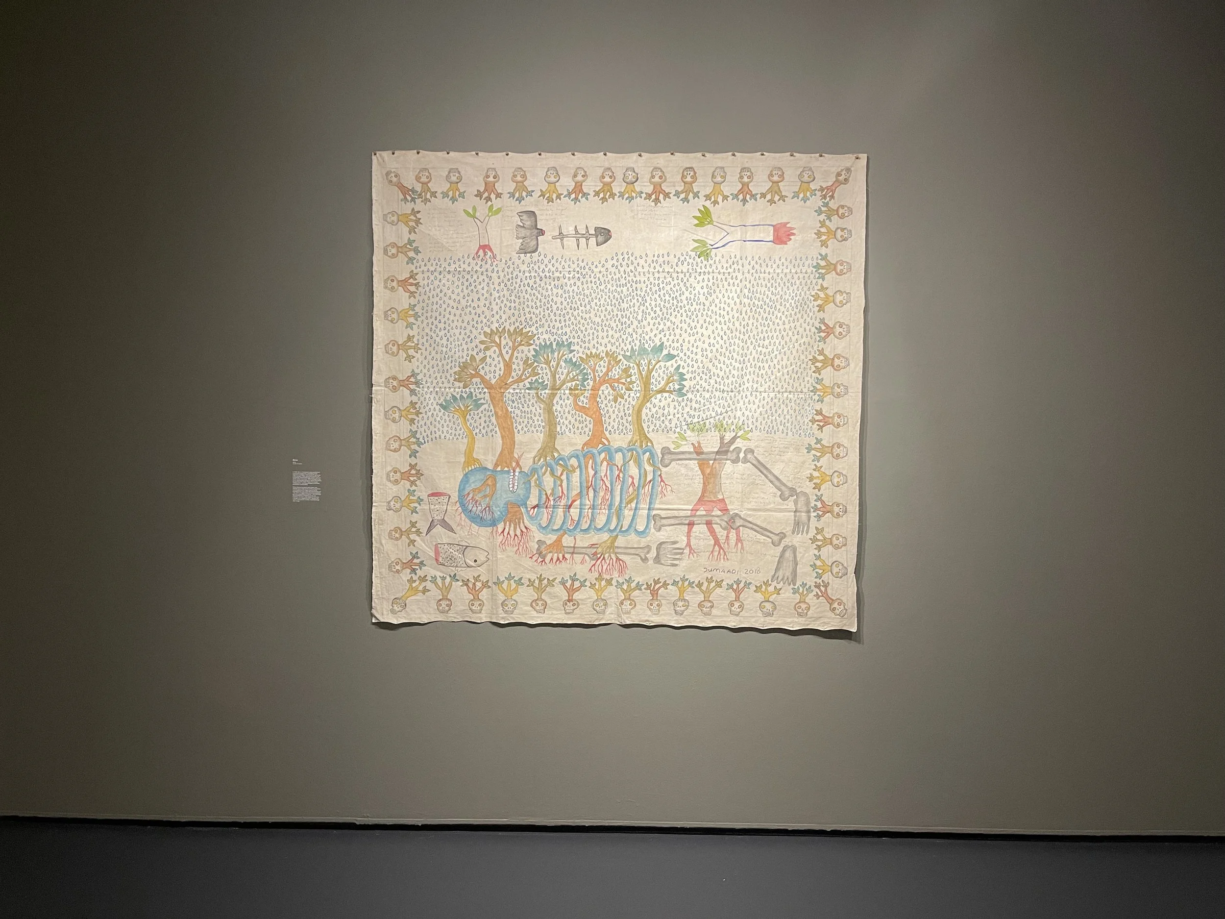 Through mythographic storytelling that draws on Indonesia’s Wayang Kulit (shadow puppetry) tradition, this work registers the multigenerational impacts of colonialism. You will see skeletons entwined with the roots of mangrove trees, figures embracing, tiny people dragging enormous birds, beasts and tree stumps, and babies that hang in blue bags from branches, or float in utero fed by disembodied organs.